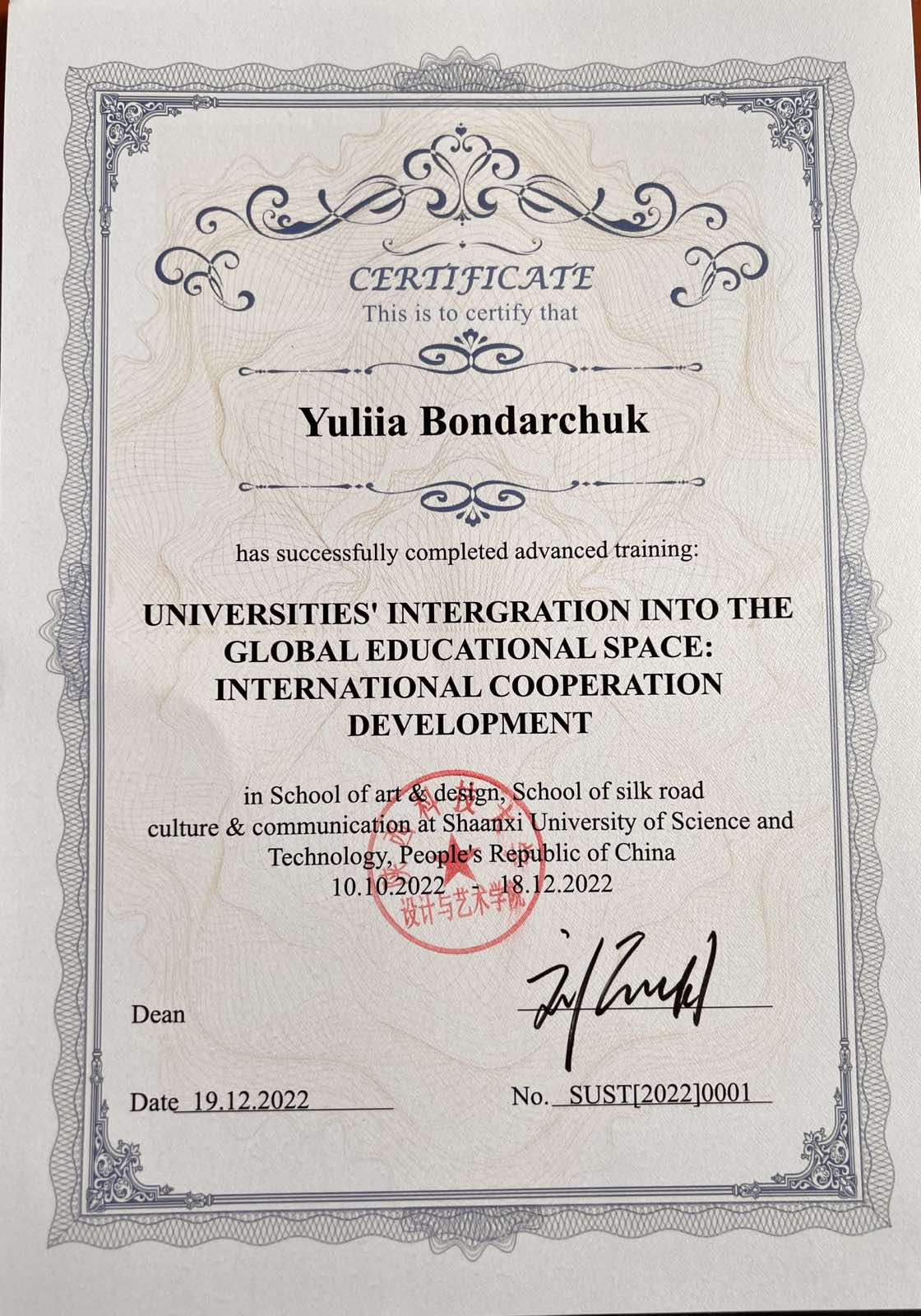 2. Сертифікат № КС (2022) 0001 від 19 грудня 2022 «Universities’ intergration into the global educational space: international cooperation development», Китай. Строк підвищення – з 10.10.2022 р. по 18.12.2022 р. (180 годин).